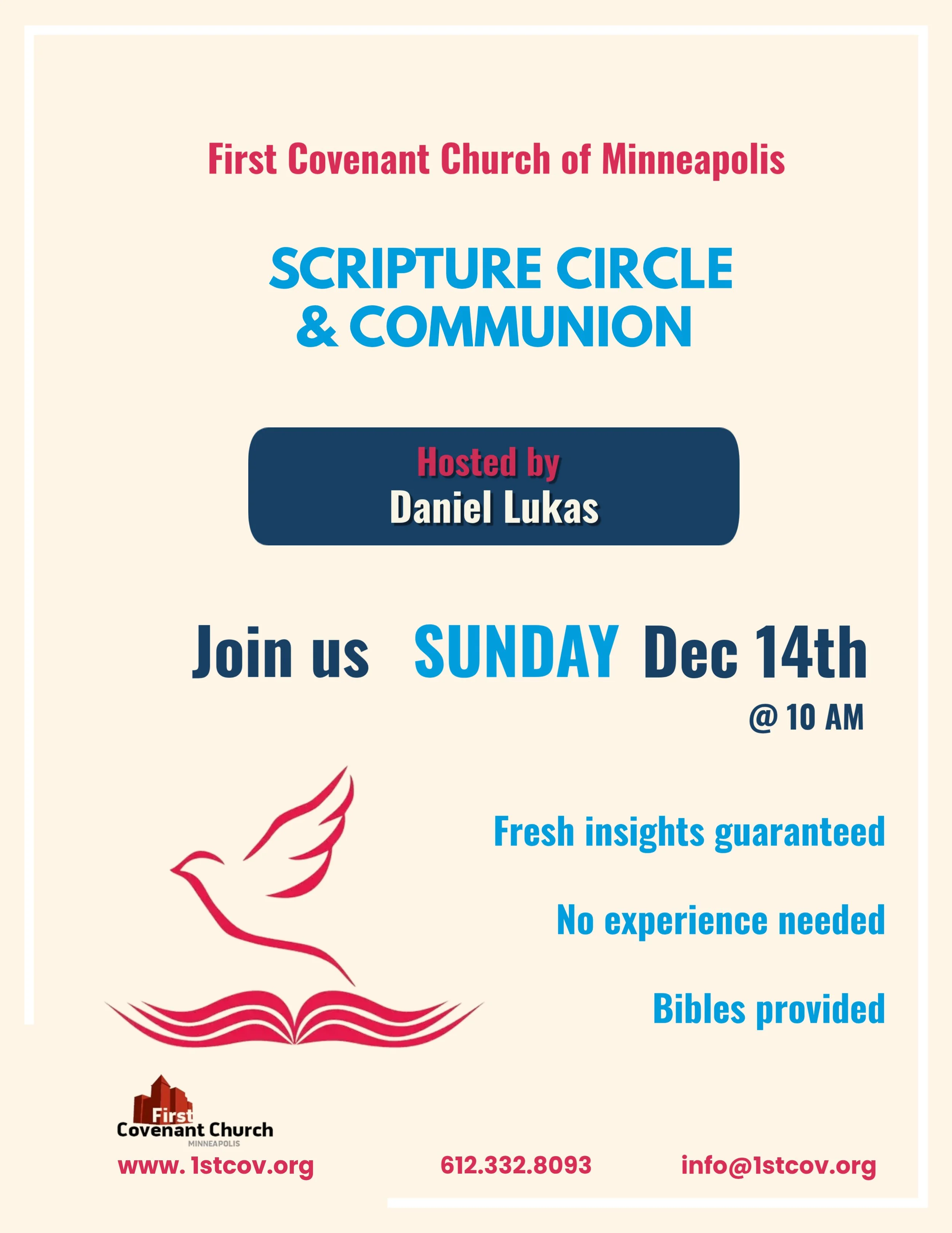 Join us on Sunday, December 14th, at 10am for a "Community Choice" Scripture Circle based on everyone's weekly check-in and then a celebration of Communion. Daniel Lukas will host. Refreshments will follow.